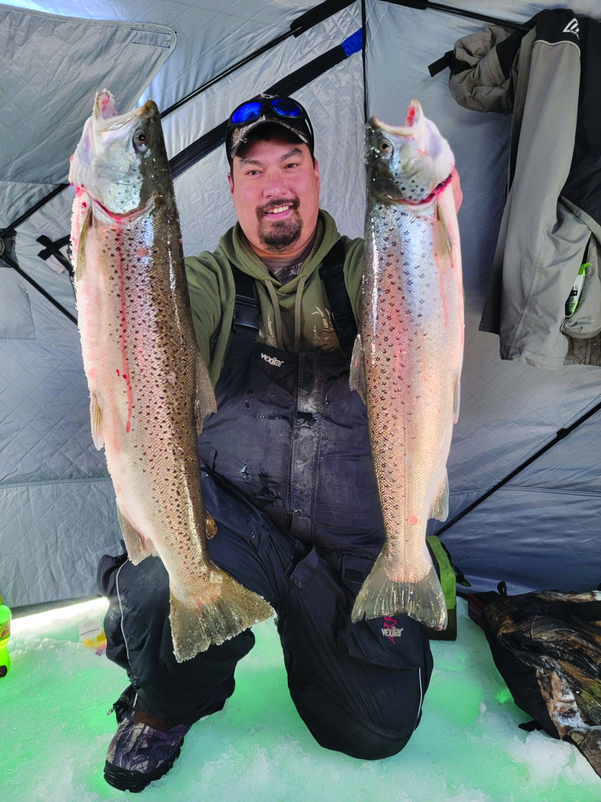 As the ice fishing season progresses and safe ice expands into the Apostle Islands, anglers start to fish deeper water for Lake trout (Bobbing). Anglers generally use a heavier rod and reel combo or a traditional “bobbing” hoop with wire line. A reel that holds lots of line is recommended since you may fish for Lake trout in 250+ feet of water but 90-180 feet of water is preferred. Heavier baits are generally used while fishing for lake trout since strong current may be present. Heavier spoons, tube jigs, swimbaits, jigging raps, or “beetles” (horizontal jigs) are popular bait choices. Adding a piece of cut bait to these may be needed to trigger the fish to bite. The average size lake trout caught through the ice is 21-23 inches, but 30-plus inch fish are frequently caught, with 35-40-inch fish occasionally caught.