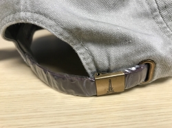 Hats come in two styles - ball cap or fishing. The ball cap is adjustable via a leather strap and brass clasp. Both are beige in color.